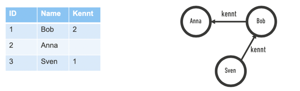Betrachten wir erneut die sozialen Netzwerke, so ist beispielsweise die Frage nach der Verbindung zwischen zwei beliebigen Personen ein relevantes Problem. In einer gängigen relationalen Datenbank würde man die Personen in einer gemeinsamen Tabelle speichern und die Verbindung zwischen einzelnen Personen in einer anderen. Sucht man auf diesem Wege nach Beziehungen zwischen zwei Personen, die eine direkte Verbindung haben, fügt man die Personen-Tabelle und die Beziehungs-Tabelle zusammen und vereint das Resultat erneut mit der Personen-Tabelle (Abb. 1).