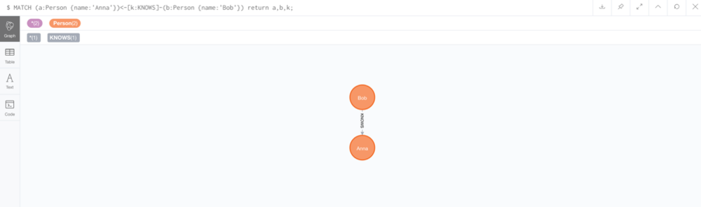 $ MATCH (a:Person {name:'Anna'})-[:LIKES]->(s:Person {name:'Sven']) return a,s;