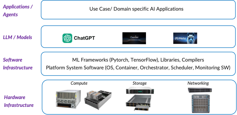 Die Hardware-Infrastruktur mit Computing, Storage und Netzwerk bildet das Fundament für den KI-Stack. Im Bereich Computing betrifft es KI-Server mit Beschleunigern (GPUs/XPUs), CPUs, High Bandwidth Memory (HBM) und Hochleistungs-Netzwerkschnittstellen. Speichersysteme werden verwendet, um die GPUs/XPUs mit Daten zu versorgen und Zwischenergebnisse zu überprüfen, um Ausfälle zu verhindern. Die GPUs/XPUs in diesen Servern laden das Modell und die Daten in den HBM, führen mathematische Operationen aus und erzeugen Ergebnisse. Diese werden dann zwischen den GPUs/XPUs über ein hochskalierbares Netzwerk mit niedriger Latenz ausgetauscht. Während der Trainingsphase wiederholt sich dieser Rechen- und Kommunikationszyklus über Tage bis zu Wochen.