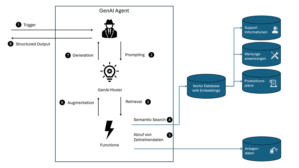 Maschinendaten wie Sensorwerte, Logs und Betriebsparameter können in den Retrieval-Prozess integriert werden, um aktuelle, spezifische Informationen zu liefern. So können bei einer Wartungsanfrage etwa Sensordaten zur aktuellen Maschinenauslastung herangezogen werden, um praxistaugliche Empfehlungen zu generieren.