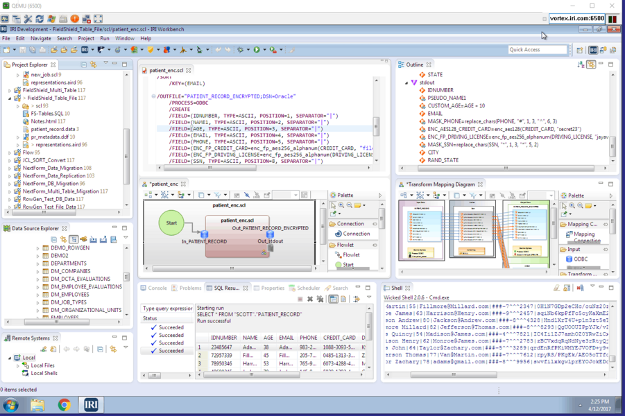 Mit diesen Mitteln lassen sich Testdatenbanken für Funktionstests, Stresstests oder Continuous Integration-Prozesse sicher und realitätsnah befüllen. Dabei können die Daten aus den unterschiedlichsten Quellen stammen, d.h. Mainframe-Systeme, relationale Datenbanksysteme (Oracle, SQL Server, DB2, PostgreSQL) bis zu modernen Big Data-Formaten (Kafka, NoSQL). Die Anwender nutzen die visuelle IRI Workbench (Eclipse) zum Design der Jobs, die dann ohne Programmierung über die im Hintergrund arbeitenden Engines ausgeführt werden.