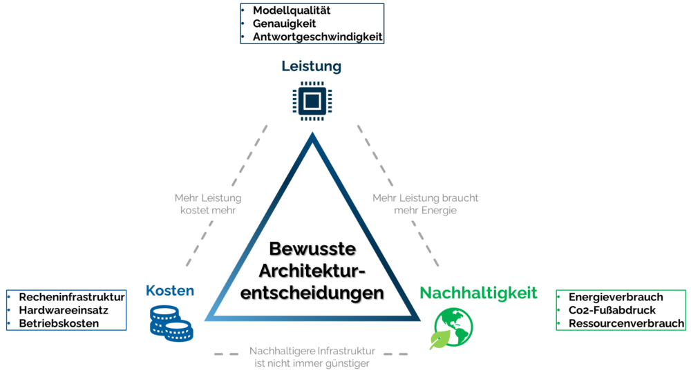 Ein offensichtlicher Konflikt besteht zwischen der Modellleistung und dem Energieverbrauch. Größere Modelle liefern häufig bessere Ergebnisse, verbrauchen jedoch deutlich mehr Ressourcen. Auch der Zeitdruck spielt eine Rolle. Schnelle Markteinführung lässt wenig Raum für Optimierung. Nachhaltige Ansätze erfordern hingegen zusätzliche Analyse und Abwägung. Hinzu kommt oft die Kostenfrage, denn klimafreundliche Cloud-Regionen oder zeitliche Steuerung von Rechenlasten sind nicht immer die günstigste Option.