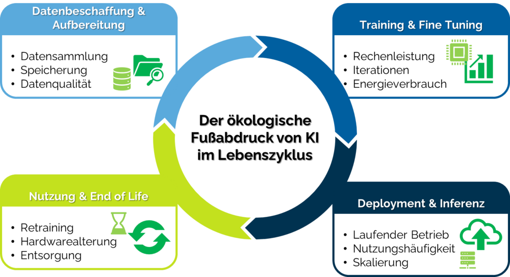 Der tatsächliche ökologische Fußabdruck von KI ist allerdings sehr komplex. Er entsteht nicht nur während des Trainings eines Modells, sondern über dessen gesamten Lebenszyklus hinweg. Daten müssen gesammelt, gespeichert und verarbeitet werden.