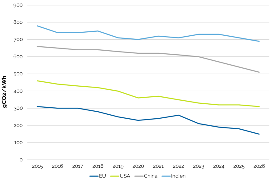 - International Energy Agency (IEA). (2026). CO₂ intensity of electricity generation in selected regions, 2015–2026 [Datengrafik]. IEA, Paris. Lizenz: CC BY 4.0. https://www.iea.org/data-and-statistics/charts/co2-intensity-of-electricity-generation-in-selected-regions-2015-2026 [Abgerufen: 31. März 2026]