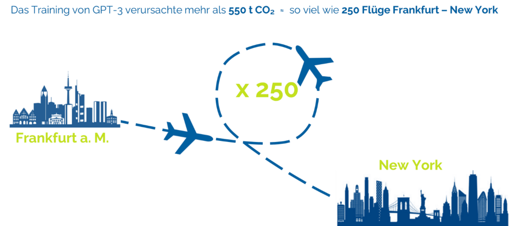 Um die Dimensionen greifbar zu machen, lohnt ein Blick auf konkrete Zahlen. Das Training großer Sprachmodelle verursacht CO2-Emissionen in einer Größenordnung, die mit bekannten Emissionsquellen vergleichbar ist. Einzelne Trainingsläufe können Emissionen verursachen, die denen von Langstreckenflügen entsprechen. (Modelling-Tool zur Berechnung des CO2-Fußabdrucks von Prompts [4]).