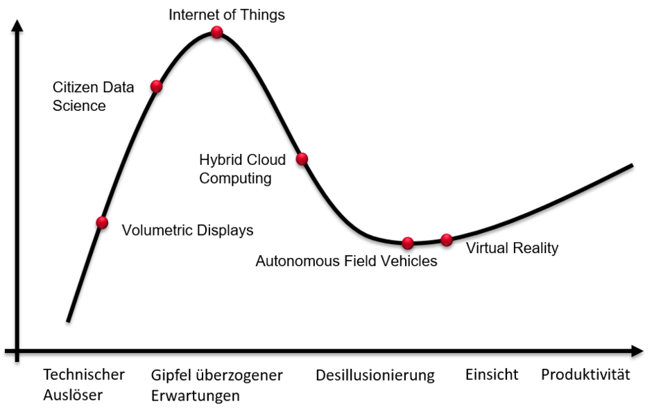 Die Entwicklung des Internet of Things findet sich derzeitig am Scheitelpunkt der Kurve des vielzitierten Hype Cycle der Analysten von Gartner wieder (vgl. Abb.1). Es hat den Gipfel der überzogenen Erwartungen erreicht und tritt in die Phase der Desillusionierung ein. Diese negative Entwicklung wird trotz der Tatsache vorhergesagt, dass das Internet of Things maßgeblich für die Digitalisierung unserer Welt und zwar in allen Bereichen des Lebens und Arbeitens verantwortlich ist. Dabei verändert sich das Internet of Things täglich, auch da die einhergehende Digitalisierung einen Prozess beschreibt, der noch längst nicht abgeschlossen ist. Das IoT steht in den einzelnen Domänen für die Vernetzung der verschiedenen (Mikro-)Ökosysteme. Entsprechend wird gegenwärtig in vielen verschiedenen Domänen der Einsatz des Internet of Things nicht nur geplant, sondern intensiv vorangetrieben. Im Folgenden seien einige Beispiele für Ansätze des Internet of Things gegeben: