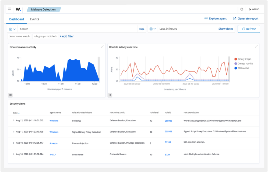 Die Plattform wird über Agenten auf Endpunkten (Linux, Windows, macOS) ausgerollt und mit einem zentralen Manager verbunden, der die Ereignisse auswertet, korreliert und entsprechend verarbeitet. Visualisiert werden die Daten über den ELK Stack (Elasticsearch, Logstash, Kibana), wodurch Sicherheitsanalysten eine detaillierte und durchsuchbare Echtzeit-Sicht auf sämtliche sicherheitsrelevanten Ereignisse erhalten.