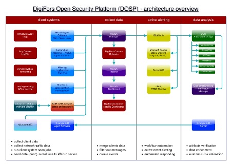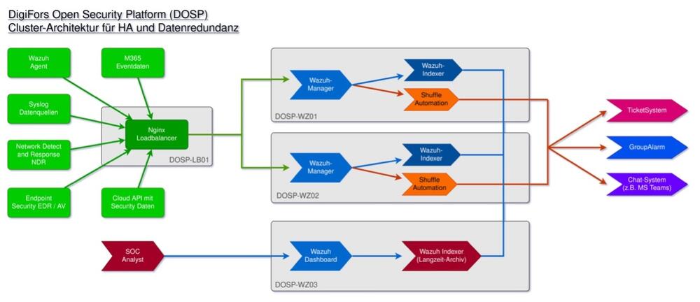 DigiFors nutzt Wazuh nicht nur intern, sondern bietet die Lösung auch als Bestandteil der eigenen DigiFors Open Security Platform (DOSP) für Kunden an. In dieser Plattform bildet Wazuh das Herzstück der Sicherheitsarchitektur und wird durch weitere Open-Source-Tools ergänzt, die gemeinsam ein leistungsfähiges, flexibles und automatisiertes SOC ermöglichen.
