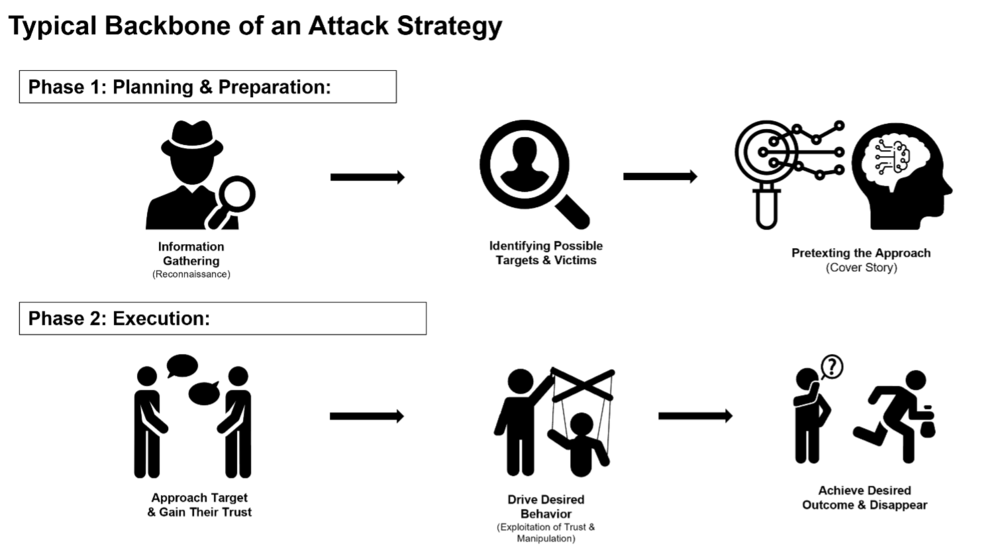 Social Engineering ist eine Kunst und eine Wissenschaft, die sowohl technische, aber vor allem verhaltensbezogene Fähigkeiten kombiniert. Im weiteren Verlauf des Artikels werden wir einige der gängigsten Social-Engineering-Ansätze besprechen, zusammen mit der Analyse der psychologischen Ausnutzung, die bei einem erfolgreichen Angriff ins Spiel kommt. Obwohl es einige gängige Ansätze oder Szenarien gibt, können die möglichen Social-Engineering-Methoden und -Szenarien endlos sein und hängen von der Vorstellungskraft und den Fähigkeiten der Angreifer, aber auch der Zielperson selbst ab.