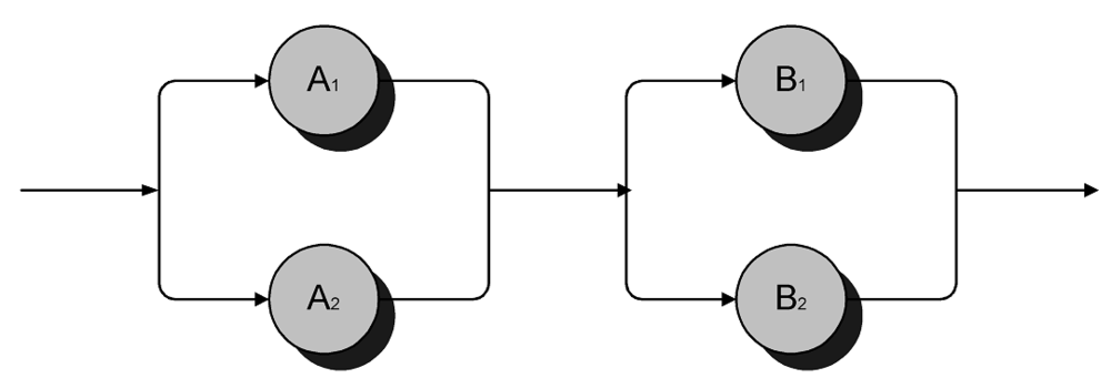 Geschätzte Ausfallzeit des Gesamtsystems: ~ 38 Sekunden / Jahr In diesem Beispiel sind nun noch jeweils die Komponenten A1 und B1 sowie A2 und B2 in Serie geschaltet. Das hat zur Folge, dass bei Ausfall der Komponente A1 der Gesamtzweig1 nicht mehr verfügbar ist. Hebt man diese Serienschaltung auf und parallelisiert auch hier, so kommt man zu Beispiel 3.