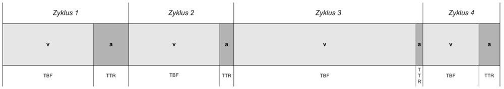 Grundlagen zur Ermittlung typischer Metriken der Verfügbarkeit sind also Time Between Failure (TBF) und Time To Repair (TTR). Im Zeitverlauf der Systemzustände setzt sich ein Zyklus aus einer Folge von TTF und TTR zusammen.