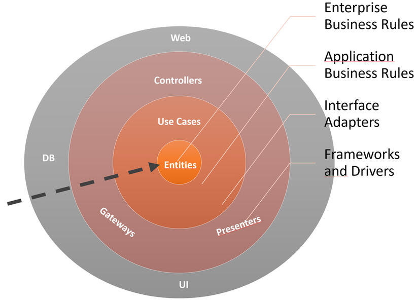 Einen besonderen Fall stellt die Domänenlogik einer Anwendung dar. Diese ändert sich in vielen Fällen eher selten und sollte nicht davon abhängen, welche Benutzerschnittstelle oder Datenspeicher man nutzt. Sie ist der Kern der Anwendung und muss daher so gestaltet werden, dass sie möglichst wenige ausgehende Abhängigkeiten besitzt, damit sie dauerhaft weiterverwendet werden kann. Einzige Ausnahme in diesem Zusammenhang stellt wiederum das Domänenmodell dar. Jenes beschreibt die Datenstruktur einer Domäne und zieht sich zumindest in ihren Grundstrukturen auf Dauer durch die gesamte Applikation inkl. diverser Drittsysteme wie Datenbanken usw.