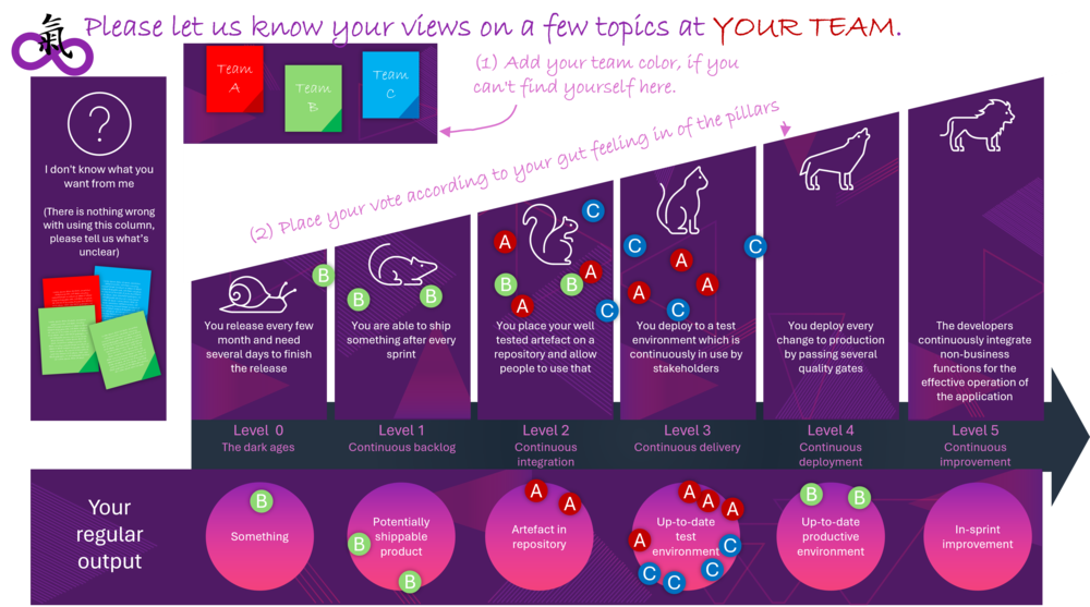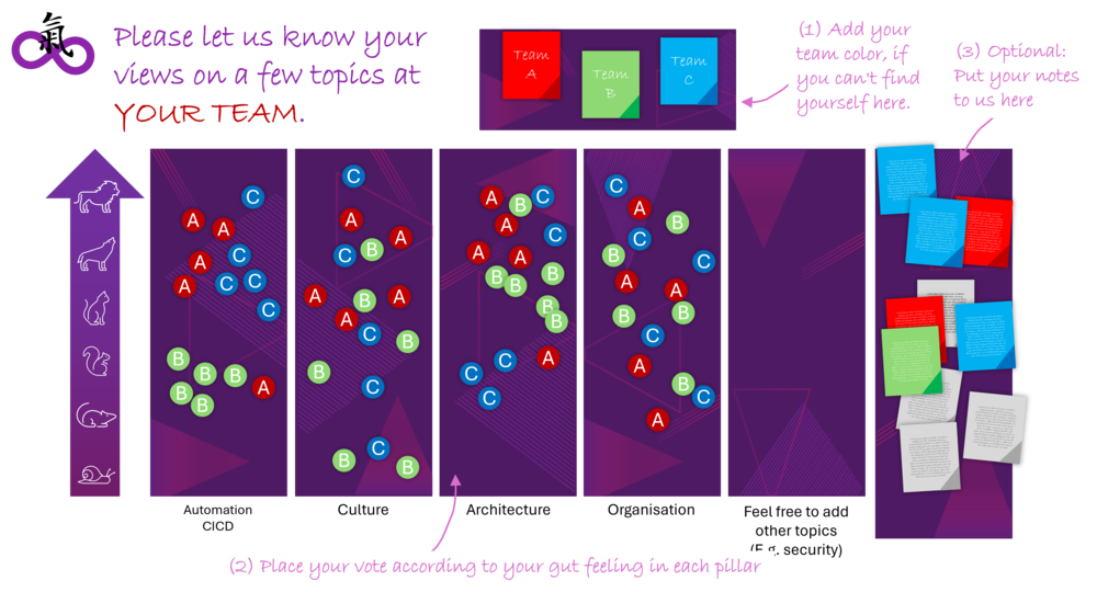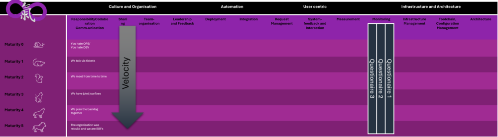 - Nutze eine klare Sprache in Wort und Bild. Ich verwende gerne Tiere, um die Geschwindigkeit zu visualisieren. Dies schlägt sich auch im täglichen Sprachgebrauch nieder ("Hey, wir sind Katzen, wo steht Ihr?"). Wenn Du dies erreichst, hast du die DevOps-Reifegradanalyse (aka Anamnese) zu einem Teil Deiner Unternehmenskultur gemacht.