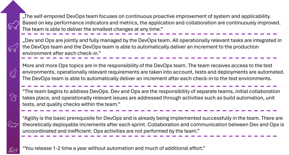 - Level 4 – Die Software wird regelmäßig auf die Bedürfnisse des Betriebs angepasst und vice versa die Plattform kontinuierlich durch das Ops-Team verbessert.