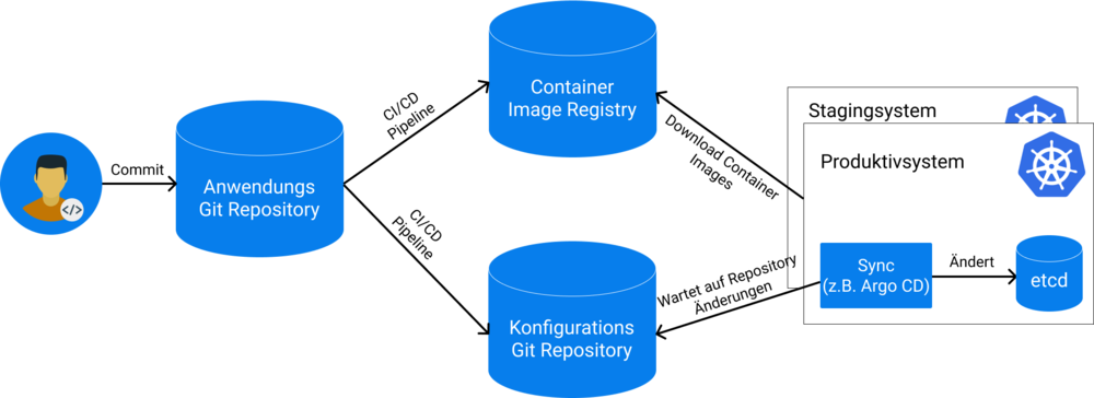 GitOps ist eine logische Erweiterung zur Idee von Infrastructure-as-code, die es ermöglicht, Infrastruktur mit Hilfe von Code, vorrangig in Public Clouds, zu definieren. Architektonisch ermöglicht es GitOps, die kontinuierliche Integration (CI) einer Anwendung von ihrem eigentlichen Deployment-Prozess zu trennen. Das ist möglich, weil der Deployment-Prozess nicht mehr direkt im Git-Repository mittels einer Pipeline ausgeführt wird, sondern durch einen entfernten Watcher im Zielsystem, der Änderungen im Git-Repository asynchron bearbeitet. Damit ist es z. B. nicht mehr nötig, Zugangsdaten zum Produktivsystem in einer CI/CD-Pipeline zu speichern, was die Sicherheit erhöht. Außerdem ist es möglich, mehrere Zielsysteme zu definieren, ohne Änderungen am eigentlichen Git-Repository oder der CI/CD-Pipeline vornehmen zu müssen.