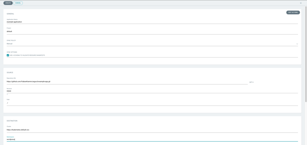Nun klicken wir in der Argo-CD-Weboberfläche auf den Knopf '+ NEW APP' und erstellen eine neue Applikation mit den folgenden Einstellungen, s. Abb. 4: