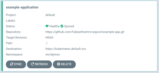 Wir bestätigen mit 'Create' und sehen im Hauptbildschirm eine neue Applikation, die im Moment den Status 'OutOfSync' aufweist. Nach einem Druck auf den 'Sync'-Knopf, sollte sich der Status der Applikation auf 'Synced' und 'Healthy' ändern: