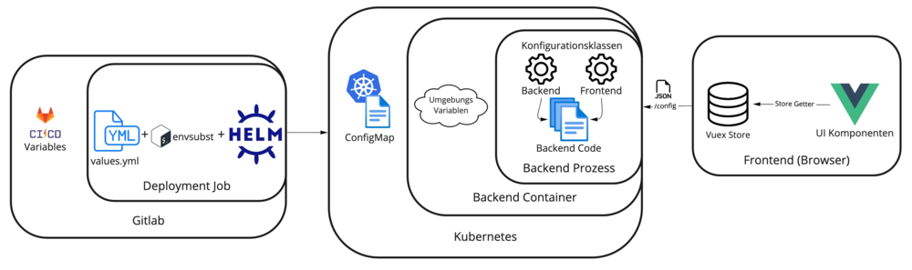 Die Änderung eines statischen Wertes in der YAML-Datei ist nur durch einen zusätzlichen Commit und Rebuild möglich. Um Feature Toggles allein durch einen Re-Deploy zu ändern, kommt zusätzlich ein weiterer Mechanismus zum Einsatz: Gitlab CI Variables[5] und das Tool envsubst[6], s. auch Abb. 3 für eine Übersicht.