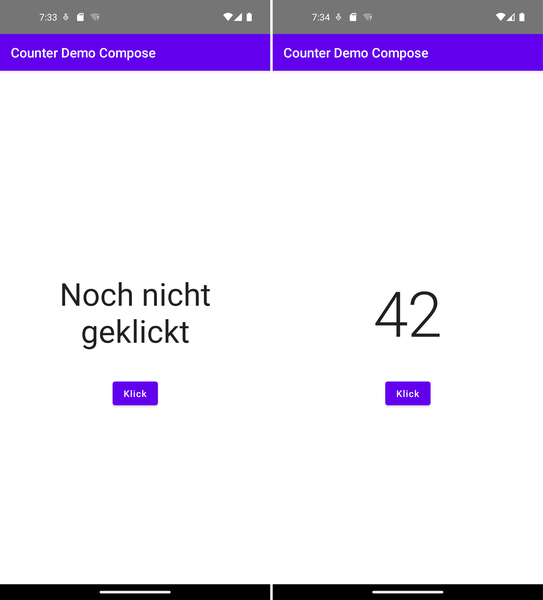 Die Oberfläche einer App entsteht, indem selbstgeschriebene oder bereits vorhandene composable functions ineinander geschachtelt werden. CounterDemo() ordnet eine Box() und einen Button in einer Spalte an. Die Box() enthält immer ein Kindelement, welches durch if (counter == 0) festgelegt wird. Ist die Bedingung wahr, erscheint der Text "Noch nicht geklickt". Bei false wird stattdessen der Wert der Variablen counter ausgegeben. counter ist ein Zustand. In Jetpack Compose wird "state" oft mit mutableStateOf erzeugt und mit remember erinnert. Ändert sich der Wert (counter += 1), sorgt das Framework dafür, dass alle Composables, die den Zustand verwenden, aktualisiert werden. Ist Ihnen aufgefallen, dass es im Listing keine Referenzen oder Zeiger auf UI-Elemente gibt? Anders als bei den imperativen Frameworks müssen keine Objekte oder Baumstrukturen manipuliert werden. Mit den nicht mehr benötigten Referenzen auf Äste und Blätter des Komponentenbaums entfallen auch die vielen korrespondierenden, schwer find- und analysierbaren Abstürze aufgrund falsch gesetzter Referenzen. Sollte eine Zustandsänderung Umbauten an internen Strukturen erfordern, kümmert sich das Framework darum.