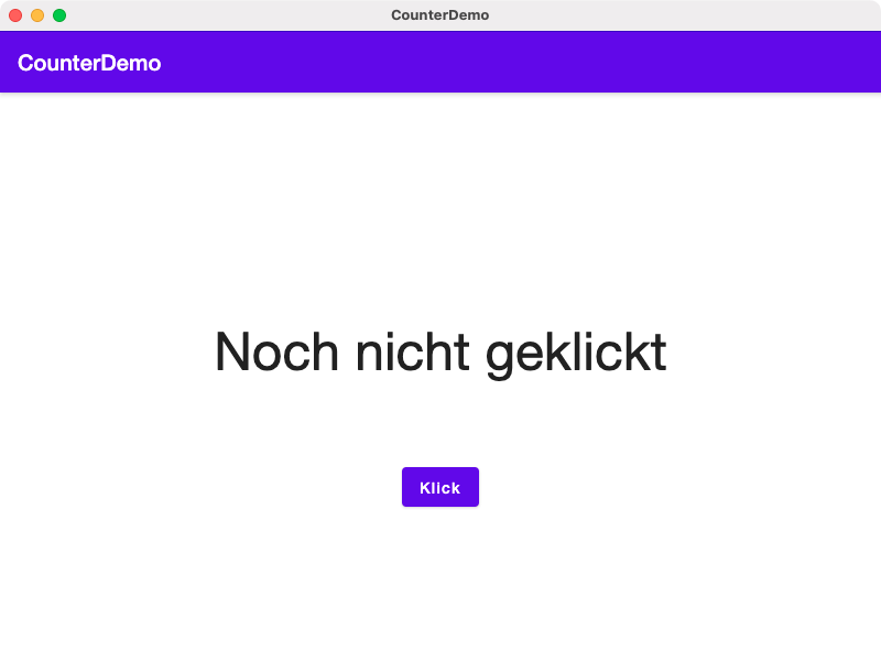 CounterDemo() wird in ein paar weitere composable functions (MaterialTheme(), Scaffold() und TopAppBar()) eingewickelt und schließlich mit setContent { } einer "Activity" (ein Grundbaustein von Android-Apps) zugeordnet.