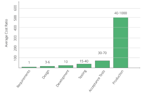 Um wirklich mit Business-Personen (Business Analyst, Product Owner oder Product Manager) zusammenzuarbeiten, ist es wichtig, alle beteiligten Perspektiven zu verstehen: Unsere Business Analysten (BAs) sind in der Regel sehr darauf bedacht, Software schnell zu veröffentlichen. Denn ein späterer Start eines (Software-)Produkts führt zu höheren Kosten und geringerem Einkommen. Die Aufgabe der QA besteht im Gegensatz dazu, sicher zu sein, dass ein solides und fehlerfreies Produkt auf den Markt gebracht wird. Es geht also darum, die goldene Mitte zwischen Geschwindigkeit und Qualität zu finden. Hierzu hat die NASA einmal aufgeschlüsselt, wo genau die meisten Kosten von Fehlern entstehen (s. Abb. 1).