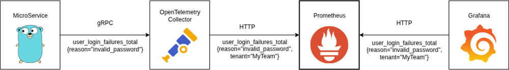 Ein Beispiel: Wir haben Grafana Dashboards, die Metriken aus unseren Services visualisieren. Diese Metriken gehen zuerst an einen OpenTelemetry Collector, der ihnen ein "Tenant" Label verpasst und landen dann in Prometheus. Von dort zieht Grafana sie wieder heraus und stellt sie dar. Klingt einfach, ist aber eine ganze Kette, bei der Metriken unterwegs verloren gehen oder verfälscht werden können. Jede einzelne Station Microservice - Collector, Prometheus, Grafana - kann ausfallen oder falsche Daten liefern. Und genau das will ich überprüfen: Läuft die Komponente? Nimmt sie Metriken an? Sind die Daten am Ende im Dashboard zu sehen?