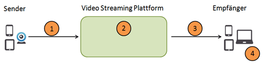 Wir haben unterschiedliche Sender eines Video-Streams. Das kann eine Webcam sein, ein Smartphone, ein Tablet oder irgendein anderes Gerät mit Kamera und Internetanschluss. Die Anforderung ist nun, dass der Video-Stream in dem Augenblick kontinuierlich an die Plattform übertragen wird, sobald der Sender beginnt, zu filmen (Punkt 1). Hier ergibt sich bereits die erste Frage: Wie soll der Stream verpackt und übertragen werden? Auf Seiten der Plattform (Punkt 2) ergibt sich als erstes die Frage: Wie soll der Stream entgegengenommen werden? Und falls der Stream zu einem späteren Zeitpunkt noch zur Verfügung gestellt werden soll, ist zu klären, wie der Stream als abrufbare Videodatei gespeichert werden kann. Im nächsten Schritt (Punkt 3) ist der Stream auf die Empfänger zu verteilen. Zu klären ist auch hier, wie soll der Stream verpackt und übertragen werden? Und wie erreicht man die Empfänger? Zu guter Letzt ist der Video-Stream beim Empfänger abzuspielen (Punkt 4). Hier ist die Frage zu beantworten, wie ein solcher Stream auf allen möglichen Empfängern (Smartphones, Tablets, Heimcomputer usw.) angezeigt werden kann.