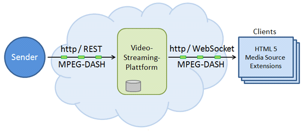 Die Grundidee für das Senden des Video-Streams ist hierbei, dass, sobald gestreamt wird, der Stream päckchenweise an die Plattform gesendet wird – im Schaubild durch die grünen Päckchen symbolisiert. Konkret bedeutet das, dass der Sender z. B. alle 2 Sekunden ein Päckchen an die Plattform sendet, in welchem 2 Sekunden Filmaufnahme enthalten sind. Bei solchen speziellen Päckchen wird von "video chunks" gesprochen. Diese chunks werden per HTTP an die Plattform gesendet und dort über eine REST-Schnittstelle entgegengenommen. Zu dem chunk können natürlich noch weitere Meta-Informationen übertragen werden. Beispielsweise könnten im Fall eines Smartphones als Sender noch Längen- und Breitengrad übermittelt werden, so dass bei den Empfängern auf einer Weltkarte angezeigt werden kann, wo gerade jemand live streamt. Und es ließe sich sogar erkennen, wenn der Streamer sich bewegt. An dieser Stelle sei bereits angemerkt, dass REST an dieser Stelle nicht zwingend notwendig ist. Die chunks könnten natürlich auch anders entgegengenommen werden.