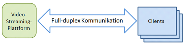 Für die Verteilung der chunks werden WebSockets verwendet. Mit WebSockets lässt sich eine bidirektionale Dauerverbindung zwischen der Plattform und dem jeweiligen Empfänger aufbauen. Bidirektional heißt, dass in beide Richtungen Daten gesendet werden können. Auf diesem Wege bekommt man indirekt eine Chatfunktionalität quasi mitgeliefert, weil auch der Empfänger etwas in Richtung Plattform schicken kann, die diese Nachricht dann wieder auf alle verteilt. Eine Dauerverbindung bedeutet, dass der Kanal permanent geöffnet bleibt. Dadurch kann die Plattform, sobald ein neues chunk angekommen ist, dieses von sich aus direkt an die Empfänger senden.