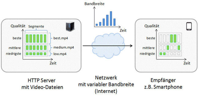 Der Ausgang ist ein HTTP-Server von welchem eine Videodatei zu einem Empfänger gestreamt werden soll. Diese Videodatei liegt allerdings nicht nur einmal, sondern in drei Qualitätsstufen vor (in unterschiedlichen Bitraten kodiert). Die Datei low.mp4 repräsentiert das Video in einer nicht so guten Qualität, die Datei medium.mp4 in einer besseren und die Datei best.mp4 in einer sehr guten Qualität. Je höher die Qualität, desto größer die Datei und desto mehr Daten müssen zum Empfänger übertragen werden.