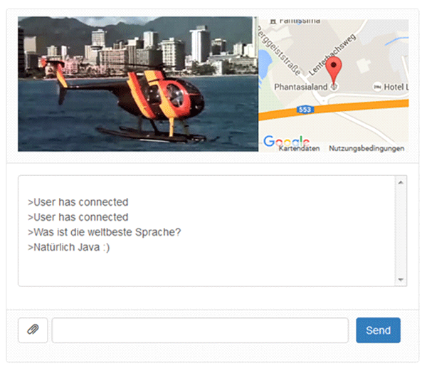 Der auf dem vorgestellten Code basierende Prototyp ist in Abb.7 zu sehen. Die Abbildung zeigt eine Momentaufnahme des Prototypen mit zwei Empfängern, die sich im Chat austauschen und einem Video-Stream, der währenddessen von einem Sender übertragen wird. Bei dem zu sehenden Stream ist eine nach MPEG-DASH-Manier zerteilte Videodatei zum Tragen gekommen, die chunk für chunk übertragen wird. Bei dem verwendeten Browser handelt es sich um den Firefox 44.0.2. Serverseitig wurde das JDK 1.8.0_40 und der Wildfly 8.20 eingesetzt.