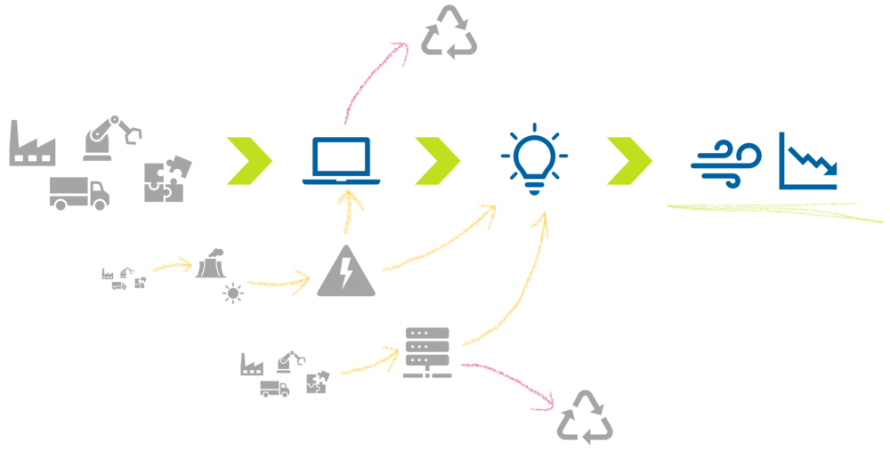 Je nach Anwendungsbereich können Unternehmen direkten oder indirekten Einfluss nehmen. So können beispielsweise Unternehmen kaum Einfluss auf die direkte Materialgewinnung der in ihrer Hardware verbauten Teile nehmen. Sie können jedoch durch einen Beschaffungsprozess anhand von Kriterien einen Anbieter auswählen, der eine umweltschonende Materialgewinnung anbietet. Andererseits haben Unternehmen einen direkten Einfluss auf ihren eigenen Energie- und Ressourcenverbrauch und können diesen durch entsprechende Maßnahmen beeinflussen. Oftmals kommt es zudem vor, dass sich Anwendungsbereiche überschneiden. Dies bietet die Möglichkeit, durch gezielte Maßnahmen Hebelwirkungen zu erzielen und dadurch die Auswirkungen zu maximieren.