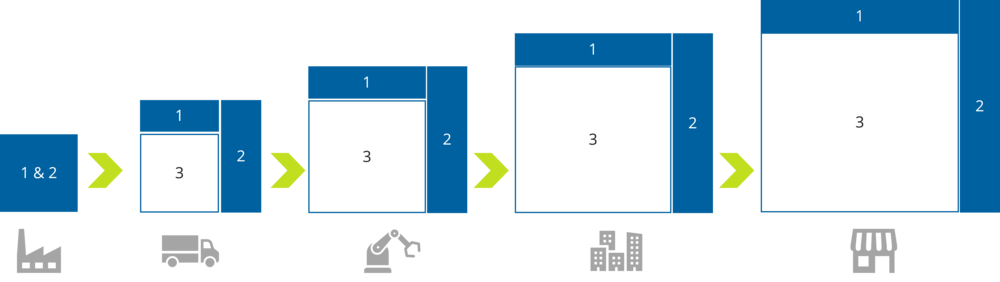 Bei genauerer Betrachtung der Scope-3-Emissionen wird klar, wieso die Vernachlässigung dieser so enorm gefährlich und schädlich ist. Wie erwähnt, können die Scope-3-Emissionen 80 Prozent der Gesamtemissionen eines Unternehmens ausmachen. Dies ist darauf zurückzuführen, dass sich die Emissionen von Unternehmen im vorderen Teil der Liefer- bzw. Wertschöpfungskette summieren. Abb. 5 visualisiert diese Situation entsprechend. Startend beim ersten Unternehmen, welches zur besseren Erklärung nur Scope-1- und Scope-2-Emissionen verursacht, wobei dies ist in der Realität nie der Fall ist. Die Scope-1- und -2-Emissionen des ersten Unternehmens sind entsprechend die Scope-3-Emissionen des zweiten Unternehmens. Dazu kommen in der Realität natürlich noch Emissionen weiterer Unternehmen die im zweiten Prozessschritt beteiligt sind. Entsprechend summieren sich die Scope-1-, -2- und -3-Emissionen der vorgelagerten Unternehmen jeweils zu den Scope-3-Emissionen des Unternehmens im nächsten Prozessschritt. Dies veranschaulicht, dass 80 Prozent der Emissionen eines Unternehmens Scope-3-Emissionen sind.