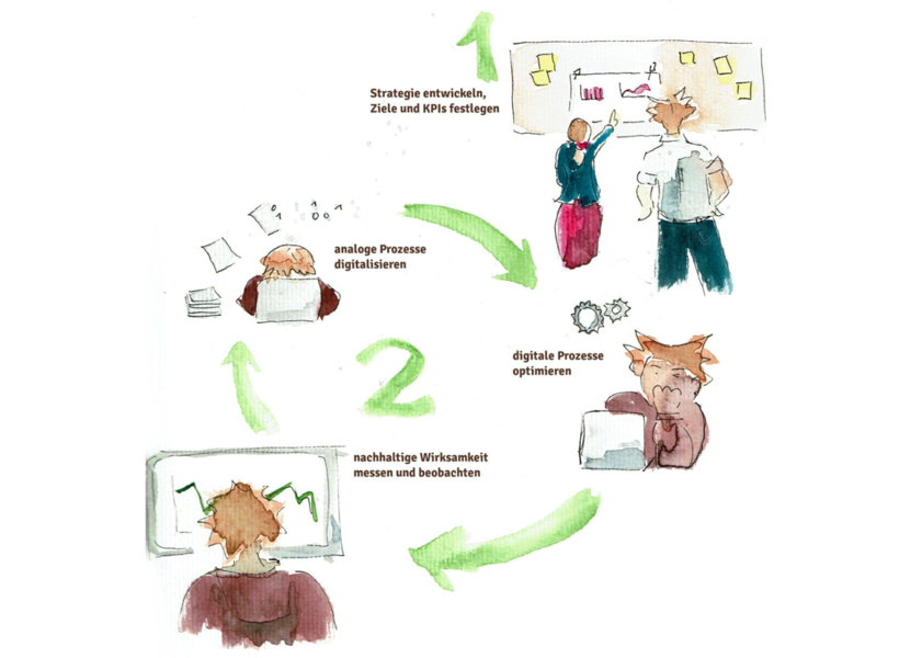 Ist der Prozess ausgewählt, folgt ein klassisches internes Software-Entwicklungsprojekt nach den bekannten Regeln. Der Prozess muss zunächst digital abgebildet werden, im Anschluss kann er optimiert werden. An dieser Stelle sollte es, wie in allen anderen Softwareprojekten auch, das Commitment aller relevanten Stakeholder geben. Einerseits müssen die Kollegen, für die das Projekt für Veränderungen im Arbeitsalltag sorgt, von der Sinnhaftigkeit der Veränderung überzeugt sein. Und da jedes Transformationsprojekt zunächst Zeit und Geld kostet und auch einen langen Atem erfordert, ist es unabdingbar, dass Geschäftsleitung und Gesellschafter überzeugt sind und das Projekt aktiv unterstützen. Sonst kann es zu konkurrierenden Zielen, versenkten Kosten oder Greenwashing-Vorwürfen kommen.